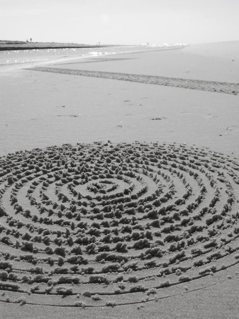 born in 1976, living in south west of France between beach and mountains, a perfect area to be inspired. The beautiful beaches that surround him and those he discovers around the world are the scene of his art. Through his drawings and his photographs, Sam makes us stop and reflect on the magic of the moment, our relationship with nature and the very essence of our beings His rake as a brush, he sublimates the landscapes with his lines, straight or curved, always in search of harmony between his work and its environment. With his works, simple or complex, he plays with space and dimensions to create these forms that question us while integrating them perfectly into the landscape. And sometimes, because Sam is also a committed artist, written messages, of an environmental, societal or political nature, take place there to bring us to reflection, even to reaction. After losing his job in 2007, Sam decides to seize the opportunity to be his own boss and make a living from what has always fascinated him: art and creation. Without any particular training, he makes use of his sensitivity which he already materializes in his adolescence in poetry. After trying to several techniques since the 2000s, from painting to sculpture, he discovered beach art in a surf video the same year and tried it a year later. A pioneer in this technique in France since 2008, he travels regularly to find new cases that he will highlight with the unique help of his rake, nature being, ultimately, the main work! Often improvised, Sam's works draw their inspiration from the surrounding nature, following lines in rocks, crevices, the shape of the beach, puddles, sometimes seeking beauty in a simple line. When traveling, the country and its culture are also an important source of inspiration, such as works from Portuguese tiles or zelliges and Arabic calligraphy in Morocco. Through photography which completes this first ephemeral work, he brings another look at his work to extract a new story and thus create a second work, sustainable this time. Through his drawings and photos, Sam reveals the poetry of the present moment, its fleetingness, its fragility and the importance of reveling in it by posing as a conscious contemplator. Beyond aesthetics.