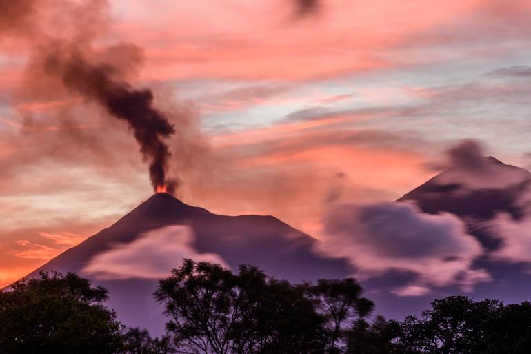Fiery lava spurts against sunset shades of pink hues as smoke and ash clouds mingle with a blur of clouds. Fuego volcano in the Guatemalan highlands has been very active this year, the frequent eruptions giving spectacular sunrise, sunset and nighttime shows. I used a slow shutter speed to blur the ...