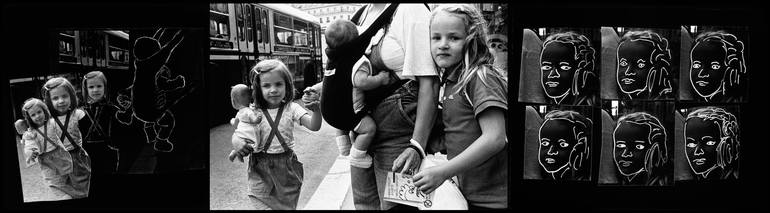Photography of a mother with her daughters in Place Clichy in Paris wich is manipulated in the dark room in ordrer to give a unique triptyque image