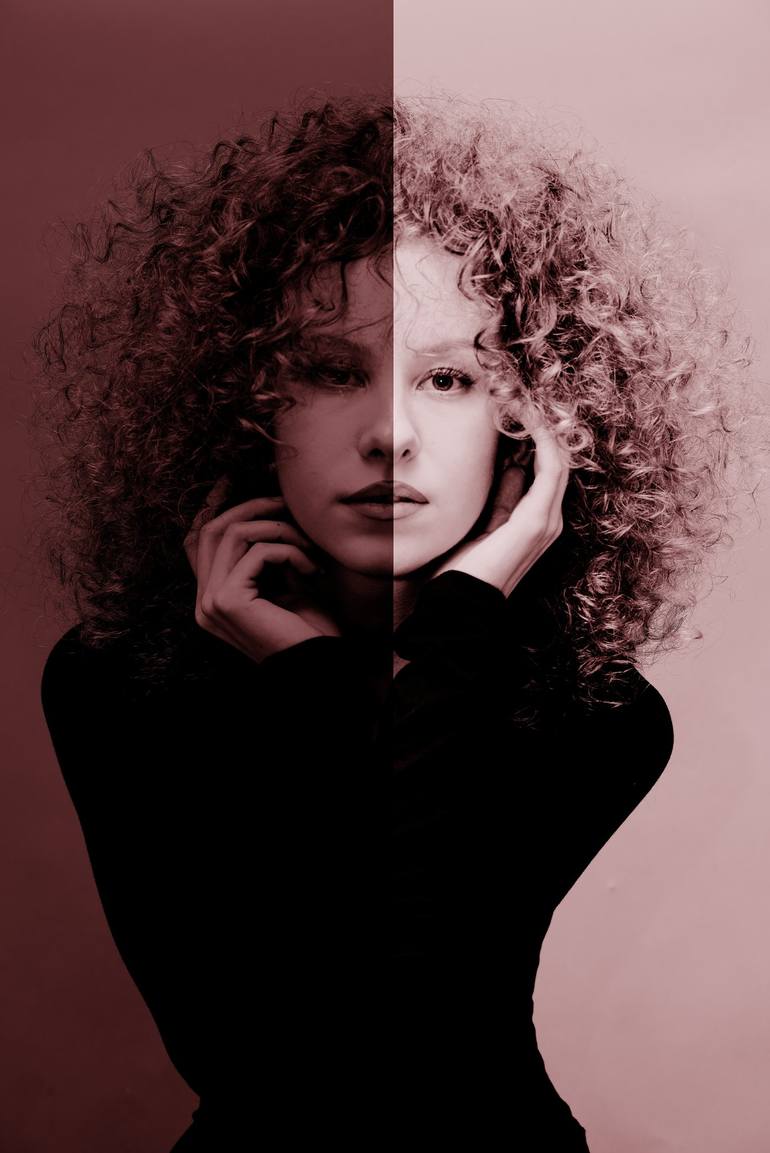 The art of the photo would focus on the interplay between hidden identity and visible style. It would emphasize the wild nature of the curls against the obscured facial features, capturing the contrast between the voluminous texture of the hair and the smooth surface of the object hiding the face. ...
