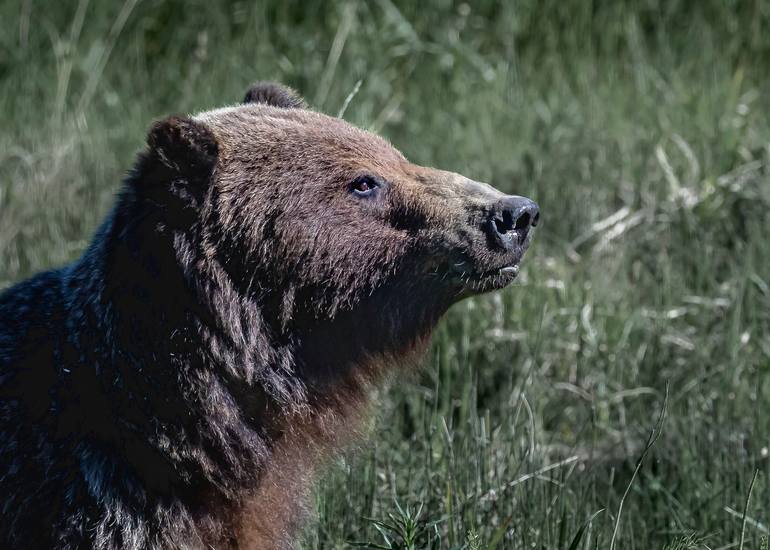 This close-up captures the majestic presence of a grizzly bear in the wilds of Alaska. The bear’s intense gaze and powerful profile are framed against a backdrop of lush green foliage, highlighting its natural habitat. The rich texture of its fur and the detail in its expression convey both the st...