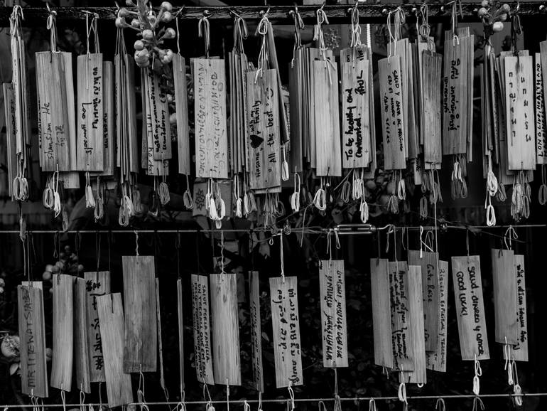 This black and white conceptual photograph brings together countless wooden wish plaques, each carrying a private intention left behind in public space. Stripped of individual voices, the accumulation becomes a collective surface where repetition replaces confession. The work reflects a quiet parado...