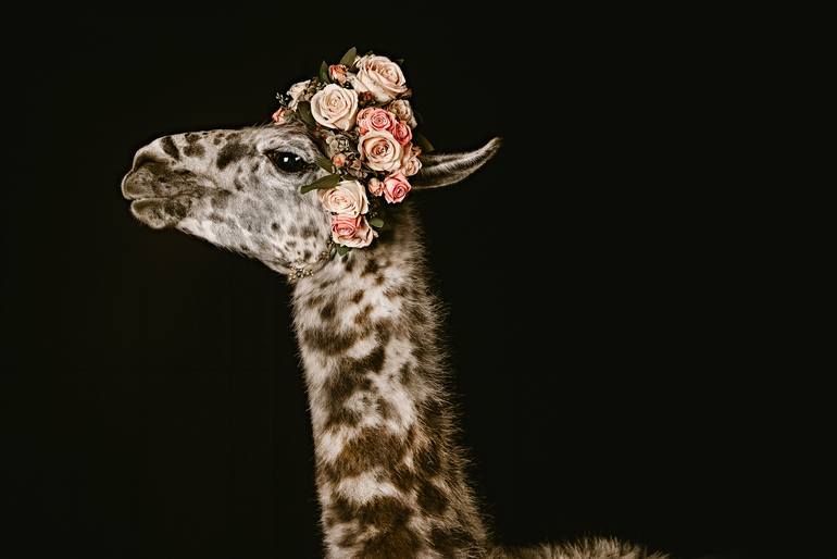 In a stable surrounded by darkness, a breathtaking sight unfolds. Flower-crowned farm animals are captured in a style reminiscent of the great master Rembrandt. Cows, sheep, and goats pose against the black backdrop, their forms illuminated by a soft light. The delicate petals of s daisies, roses, ...