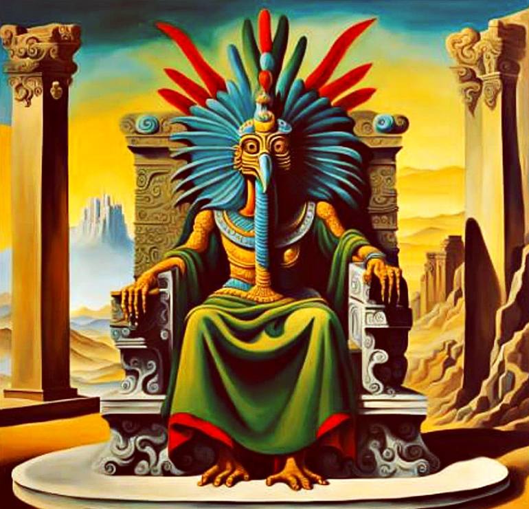 The A.I. created interpretation from my description of a surreal representation displays the Aztec god, Quetzalcoatl with a bird-like head, adorned with an elaborate headdress, sitting regally on a stone throne. Surrounded by classical columns and a backdrop of rocky desert scenery, the god exudes a...