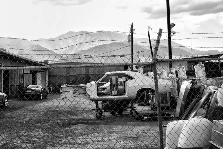 An old repair shop against the desert mountains and rare cloudy sky, captured by photographer William Dey. In the Shadows of Paradise Art Exhibition Uptown Design District Palm Springs, California. Image is printed on crisp white matte Picture Rag museum-quality paper and measures 20"W X 13.5"H with...