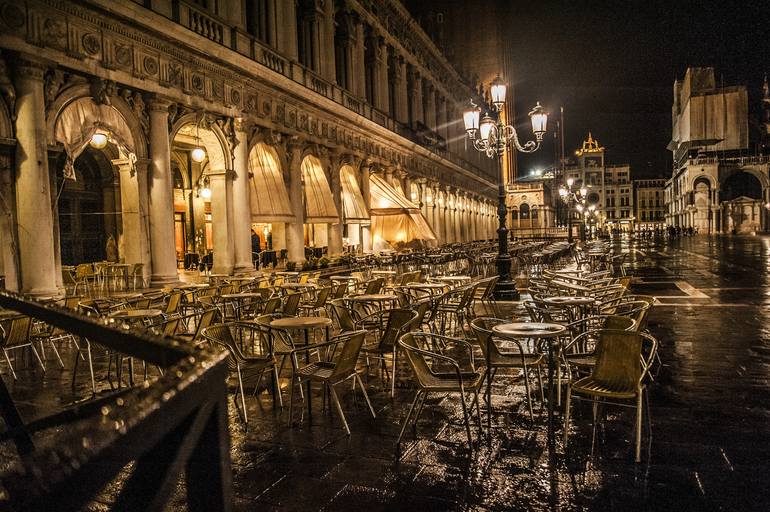 A rainy evening in Venice Italy drove tourists into cafes as I wandered across empty squares and came upon this scene near St.Mark's Square quiet and washed in a golden light like a precious jewel. I would like to convey the beauty of Venice in a quiet moment void of people as it usually is and ev...