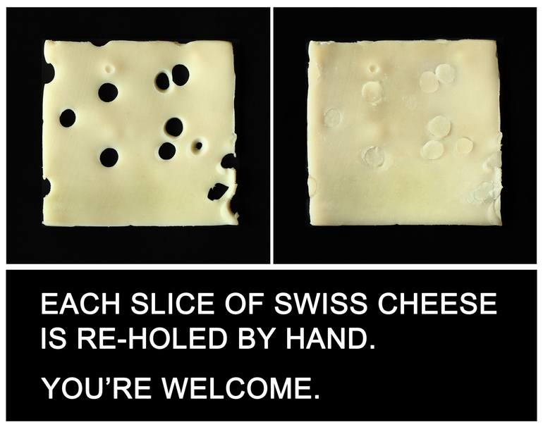 Inspired by the vast array of products available to today's consumer, and the ads that sell them, this photograph is part of a series entitled "Ad Men." The absurdity of the service rendered--in this case, "re-holing" Swiss cheese--draws attention to a product that you never knew you needed.
