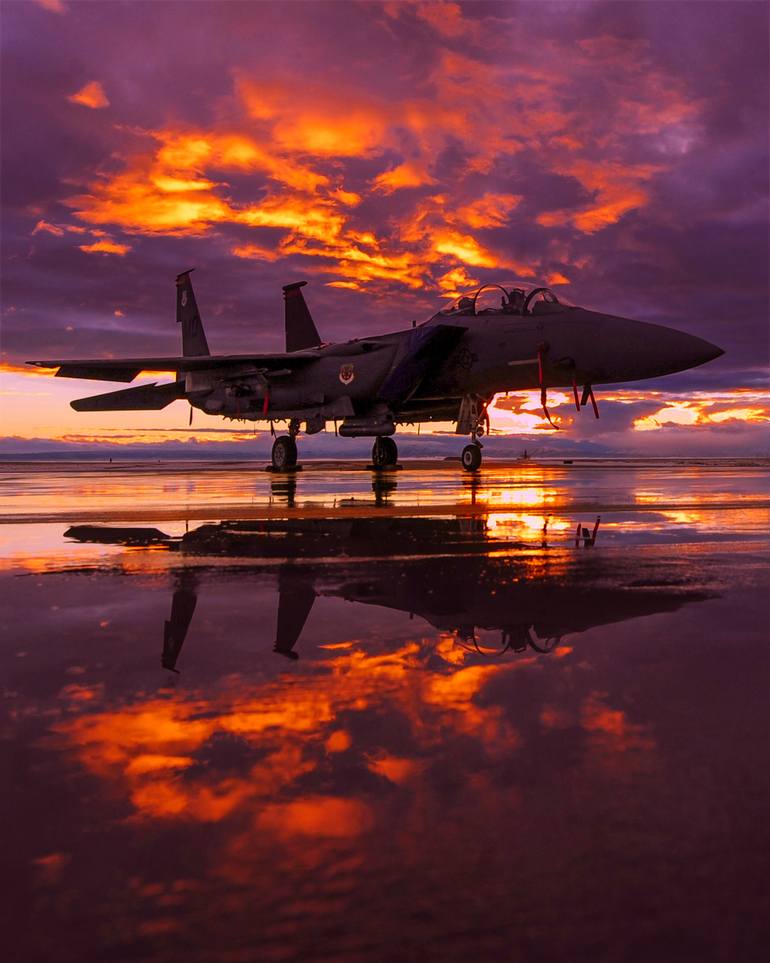 This stunning photograph captures a powerful fighter jet poised on a runway, silhouetted against a breathtaking sunset. The sky is ablaze with vibrant hues of orange, pink, and purple, creating a dramatic and mesmerizing backdrop. The reflection of the aircraft and the fiery sky in the water below a...