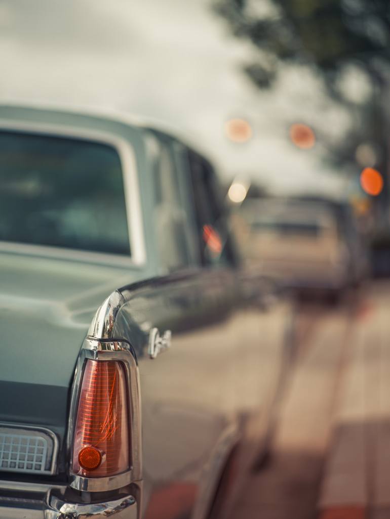 A 1964 Lincoln Continental parked next to a red curb in front of a red light intersection.