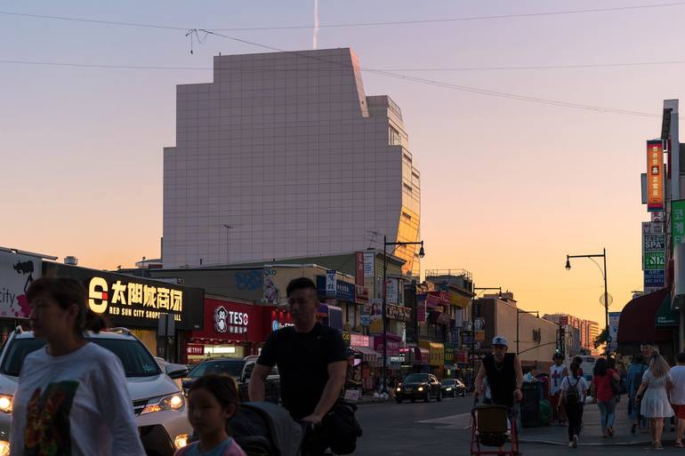 Flushing, Queens, New York City at dusk. Modernism's gleam reflects the sky's remaining light, as a bustle of shoppers below traverse the shadowy Chinatown intersection. Edition of 7 + 1 A/P and 1 P/P. Printed exclusively for the artist by Brooklyn Editions' Master Printmaker, New York City. Hahnem...