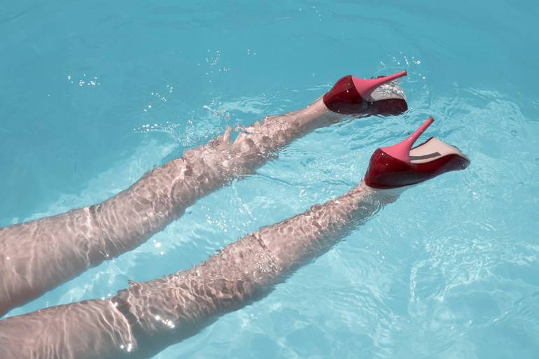 Lifeless female legs in high heels float on the water, suggesting the tragic fate of a drowned woman. The colorful heels, the focal point of this surreal artwork, embody the pressures of society’s idealized beauty standards, which increasingly prioritize appearances. The immersion in water metaphori...