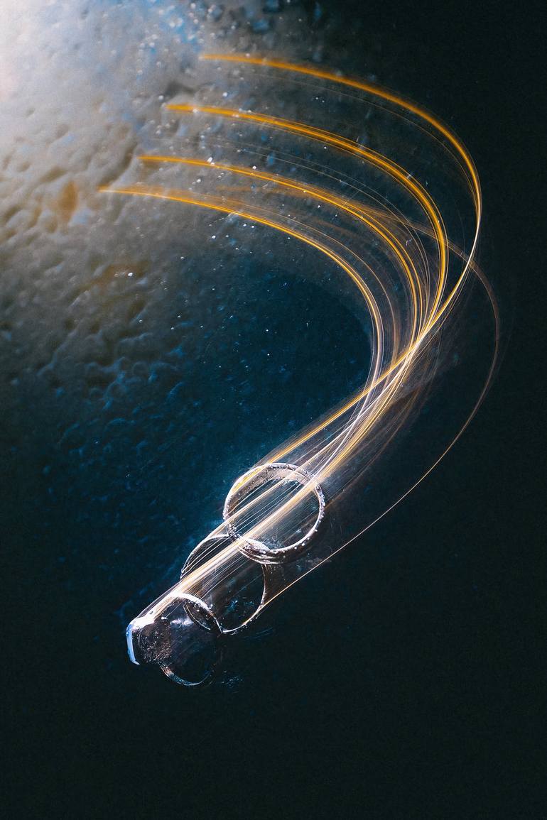 This abstract image captures the ethereal dance of light as it carves golden trails against a deep blue backdrop. The rings appear to glide in a momentary path, creating a sense of movement frozen in time. Printed on premium matte paper, this piece adds a modern, surreal touch to any space, perfect ...