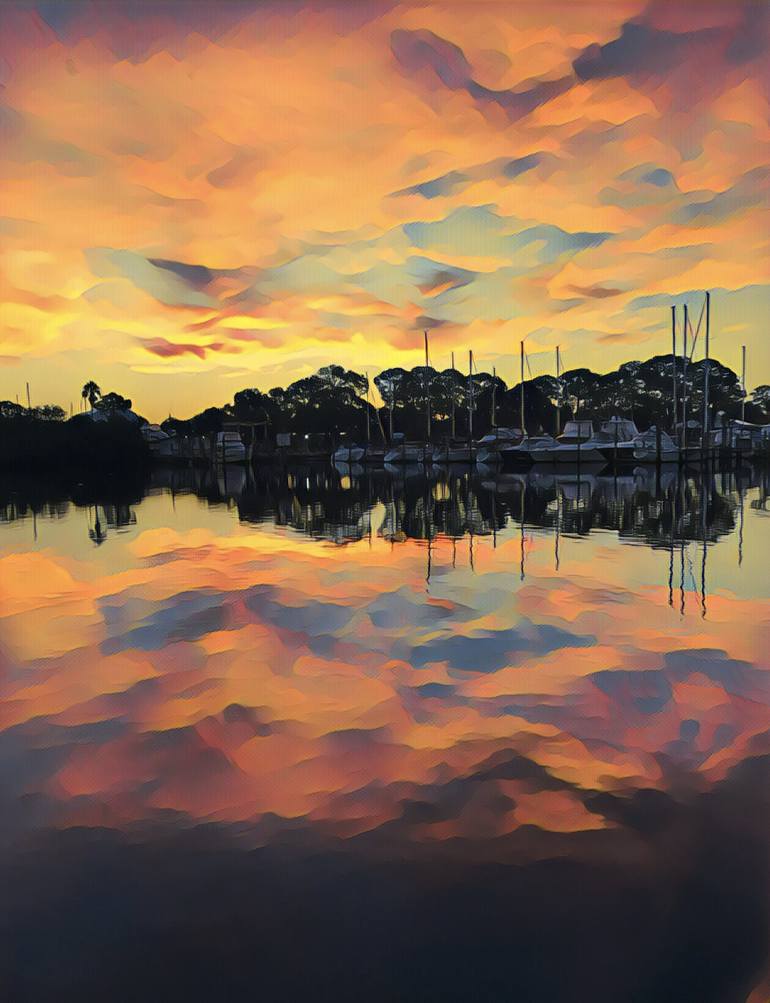 Beautiful sunrise reflections of crisp vessels and an ornate painted sky