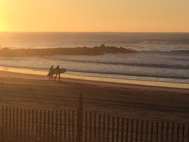 Two surfers head in for a sunset surf. They are not done for the day yet.