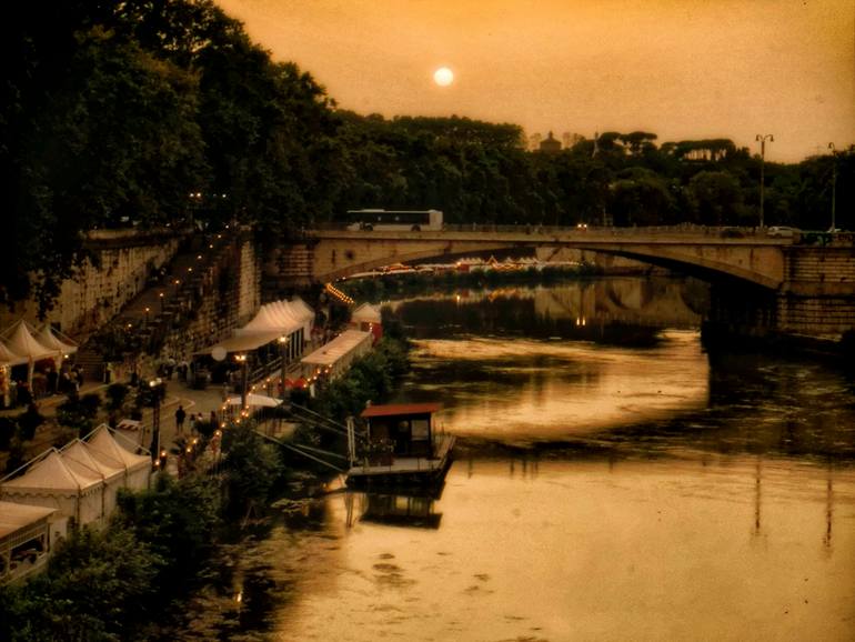 Evening is the time to wander during the summer in Rome. At the end of a steamy day the open air shops and cafes along the Tiber River beckoned. The haze softened the light into an impressionistic painting as the air cooled and the night came alive.