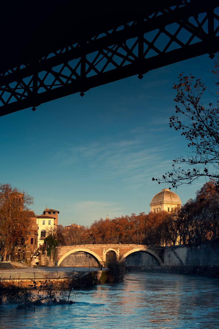 View of the sinagogue in Rome, under the iron bridge. Is it possible to see the tiberina isle on the left