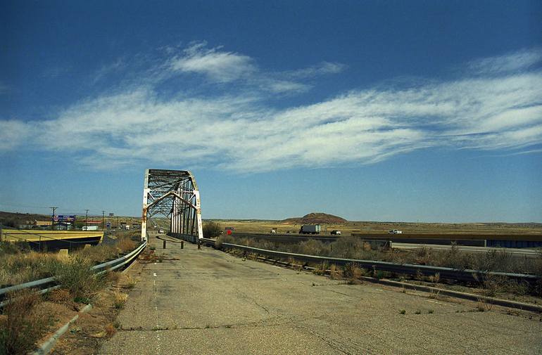 Big sky over abandoned Rio Puerco bridge, an old Route 66 river crossing. Built in 1933 near the city of Albuquerque, the interstate now runs along side it. A classic film image, softer of focus with maybe some lovely film "grain".