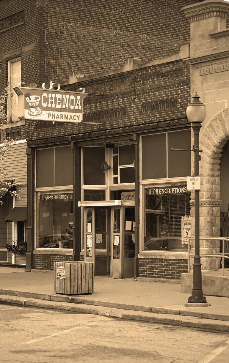Old fashioned sign for Chenoa Pharmacy drug store on Route 66, which first opened in 1889. A classic film image, softer of focus with some lovely film "grain". Sepia version.