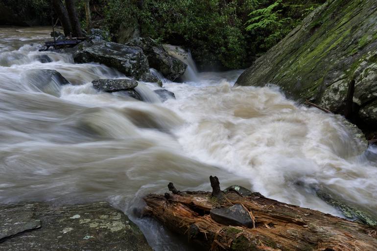 A fast-moving stream flows through a rocky forest landscape. Large boulders and fallen logs add dynamic elements to the scene. Photographed downstream of Ozone Falls, in Tennessee.