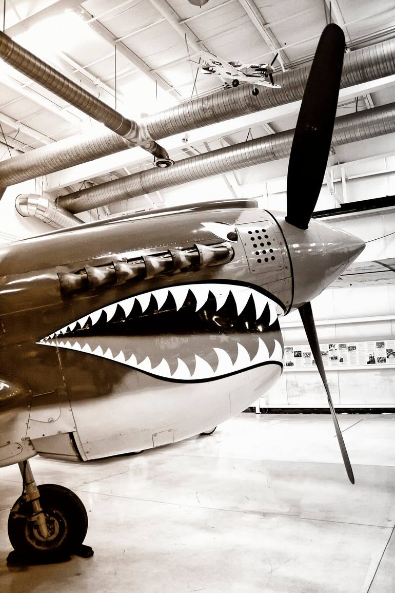 The iconic "Shark Teeth" design on a fighter airplane, captured by photographer William Dey. This first true piece of "Nose Art" has proved to be a popular decoration with fighter aircraft. Image is printed on crisp white matte Picture Rag museum-quality paper and measures 13.5"W X 20"H with additio...