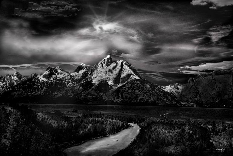 This image was inspired by Ansel Adams' iconic 1942 photograph of the same view, the Snake River Overlook in Wyoming's Grand Teton Range. The landscape of 1942 does not exist today, and thus required removing the overgrown vegetation and trees, in order to achieve the same view of 1942.