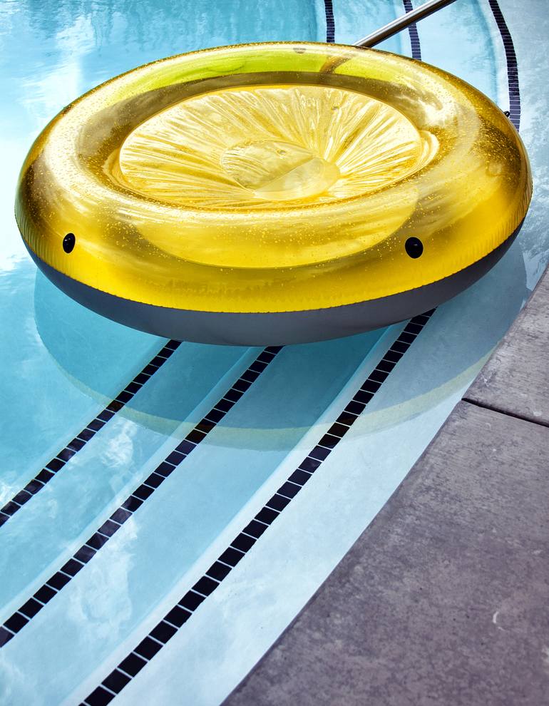 A cheerful yellow inner tube against bright turquoise water captured by photographer William Dey. "SPLASH! Liquid Assets" Art Exhibition Savage Gallery Palm Springs, California. Curated by Shawn Savage Palm Springs, California. Image is printed on crisp white matte Picture Rag museum-quality paper a...