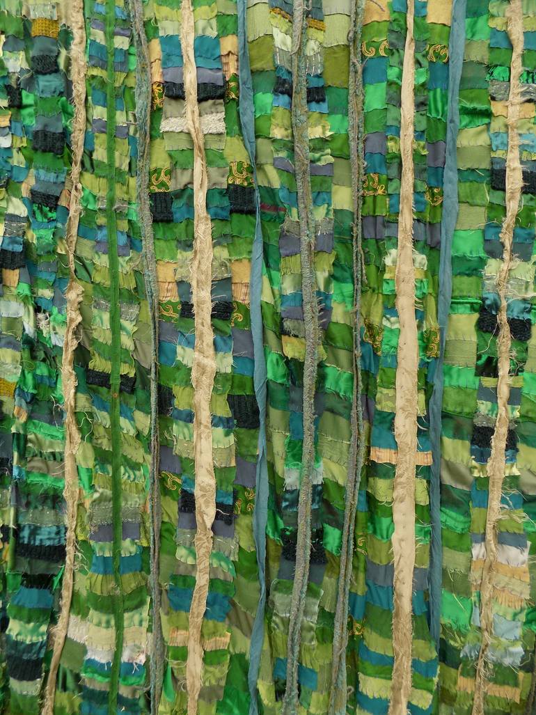 PHOTOGRAPH OF ORIGINAL TEXTILE WALL HANGING DEPICTING A SPRING GARDEN IN A RICH COLOUR PALETTE OF GREENS AND BLUES. HAND STITCHED OFF CUTS OF FABRIC WERE LAYERED TO CREATE DEPTH, WITH FRAYED EDGING ADDING ADDITIONAL TEXTURE.