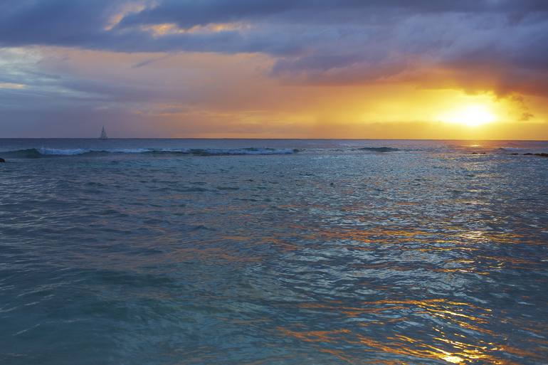 Sunset at Caribbean, Barbados. Digital photo. We can see in the background the boats that are rented for trips every day to celebrate the sunset. Photographed with a high-resolution digital camera, it allows large prints with quality color and texture, ideal for decorating environments and spaces at...