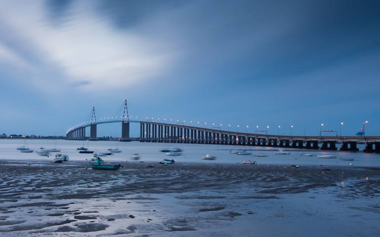 Beautiful architecture of the Saint Nazaire Bridge in the South of France, inaugurated in 1975. Shot during the blue hour. As you can see! ;)