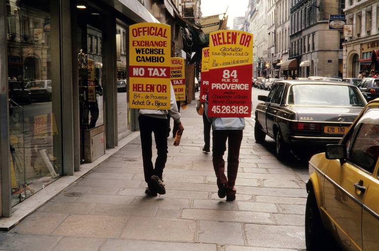 ALSO OFFERED IN A SMALLER PRINT SIZE LIMITED EDITION. 61CM X 41CM / 24” X 16" PLEASE ASK FOR CURRENTLY AVAILABLE EDITION NUMBER AND PRINT PRICE. ______________________________________________________________________________________________ A group walking down a street in Paris, France, advertisin...