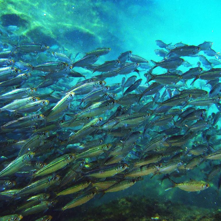 the sea moves me and I let myself go until I find colors and worlds that alter my perception. I chose to print it on cotton paper because it gives it a plus, which is its texture, and the colors expand The schools of sardines in the Riviera Maya, Akumel, in season move and ripple that make you joi...