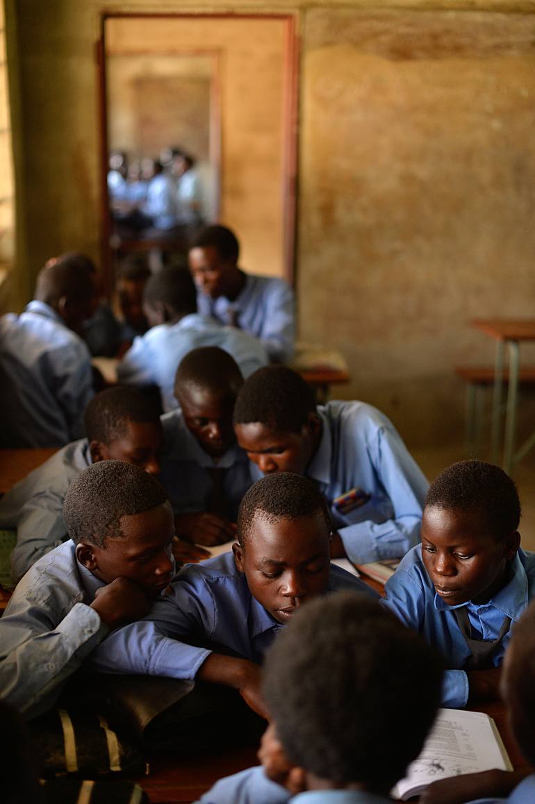Image size: 37,5 x 25 cm / Overall size: 50 x 40 cm. White margins. Classroom : children sharing books in a rural school near Kapiri Mposhi in Zambia.
