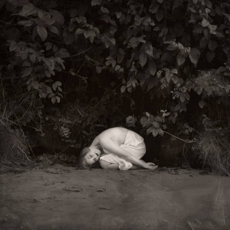 There is no big story here, no political statement or bold social commentary. My goal was to ease her into a position that fit into the dark space in the leaves, she being quite fair and light. Though the difference is stark, she is so soft, and the folds of the skirt so flowy, that the contrast doe...