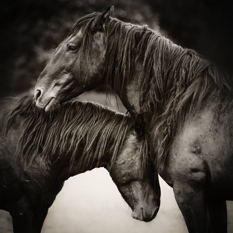 Photography: Color and Digital on Paper. Image size 20X20 Paper size 24X24 Printed on museum quality Hahnemuhle Fine Art Cotton Rag Paper, one of the finest papers on the market. Two rescued wild stallions, image taken at a wild horse sanctuary. These horses were saved from an uncertain future af...