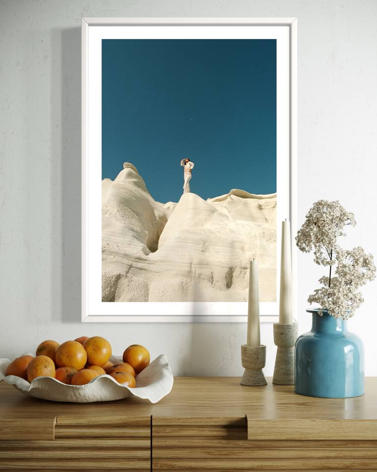 Poised atop pale, sculpted stone, Seraphine evokes the presence of a celestial figure—weightless yet grounded, human yet otherworldly. The form appears suspended between earth and sky, a moment of quiet divinity against the vast blue expanse. Shot in Milos, Greece.