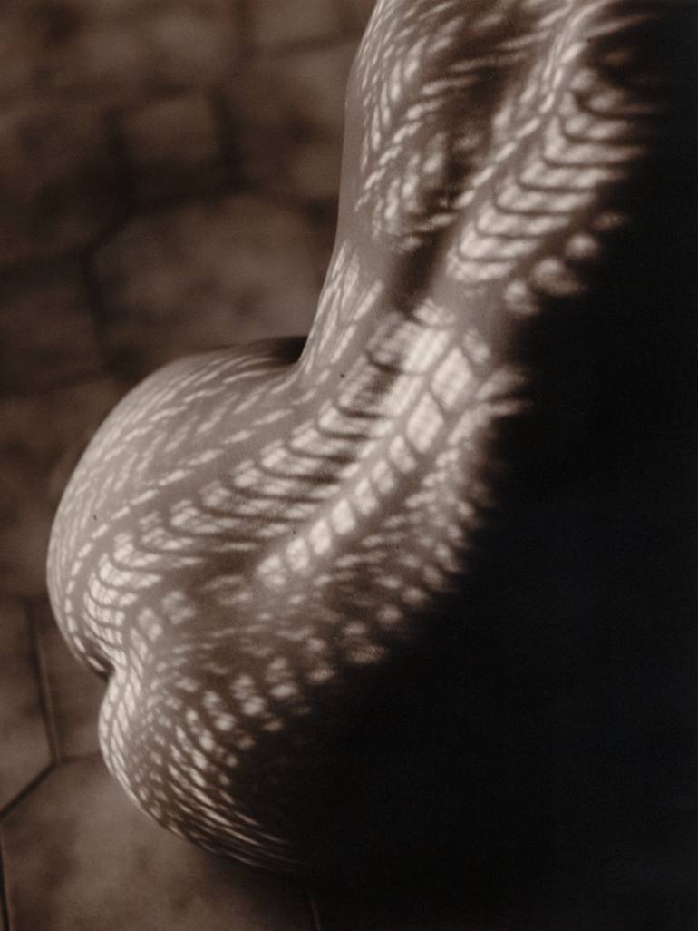 Shadows on a woman's back. A sepia rendition of a monochrome print. The original image was created using Ilford FP4 black and white film in a Bronica 645 MF film camera. Film processing, printing and subsequent sepia toning were all carried out using the author's own formulation.