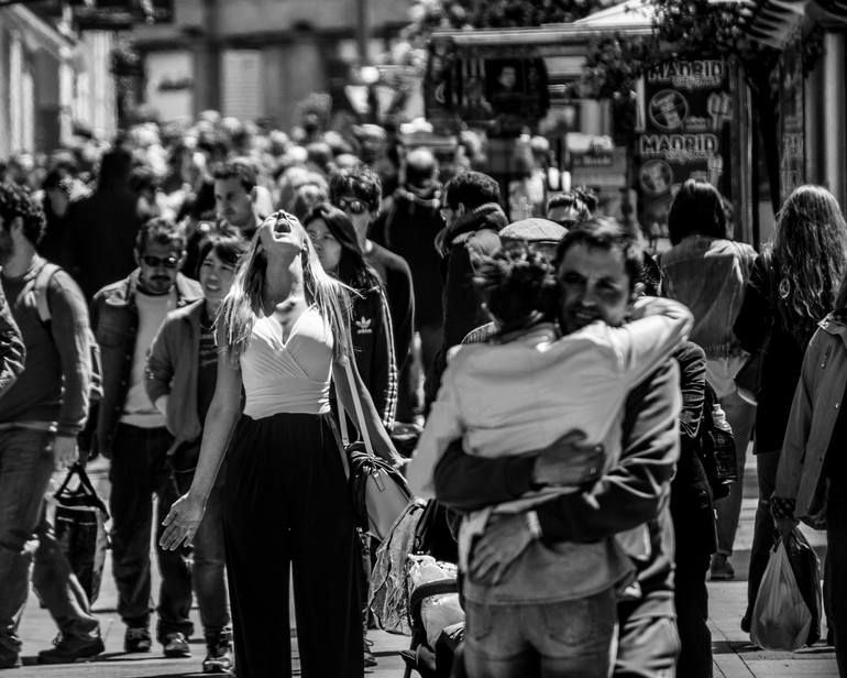 Gran Via is the most important avenue in Madrid, Spain. Life stories happen every moment there. The couple in the foreground hug with love while a character in the foreground screams anxiously.