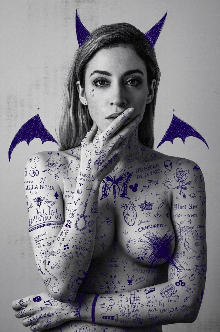 This limited edition photographic print is a striking self-portrait that captures the artist's fascination with drawing and mark-making. Set against a black and white backdrop, the artist's body is adorned with intricate, blue pen-drawn designs, creating the illusion of a canvas covered in tattoos. ...