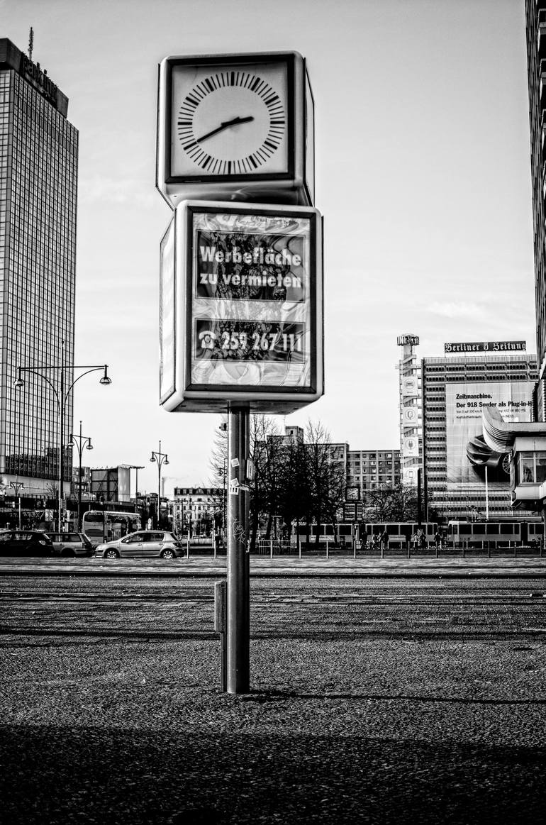 An empty sign stands on an empty street near Alexanderplatz in Berlin. Photography: Color and Digital on Paper. Limited edition print in various sizes: (size includes a 5cm border for easy framing) All printed on high quality matte photo paper, delivered in a tube roll, ready for matting and fr...