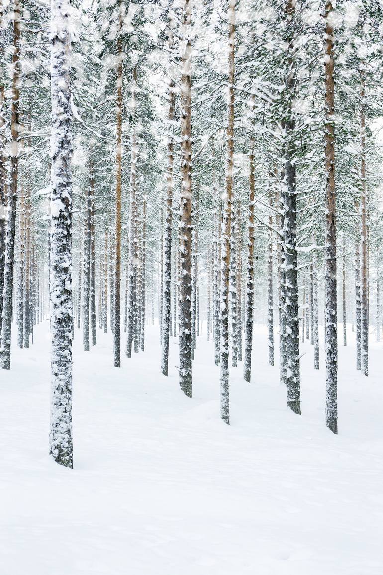 This image of the trunks of pine trees wreathed in snow was taken from a cross country ski trail near Yllas, Finland. These trails take you for miles through beautiful timeless frozen landscapes and this area in particular struck me with its quiet understated beauty. I can still sense the quiet stil...