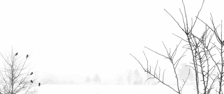 This black and white photograph captures the stark beauty and quietude of a winter landscape. The image focuses on a cluster of bare trees, their branches reaching skyward like delicate lace against the muted backdrop of the season. A few small birds perch on the branches, adding a touch of life a...
