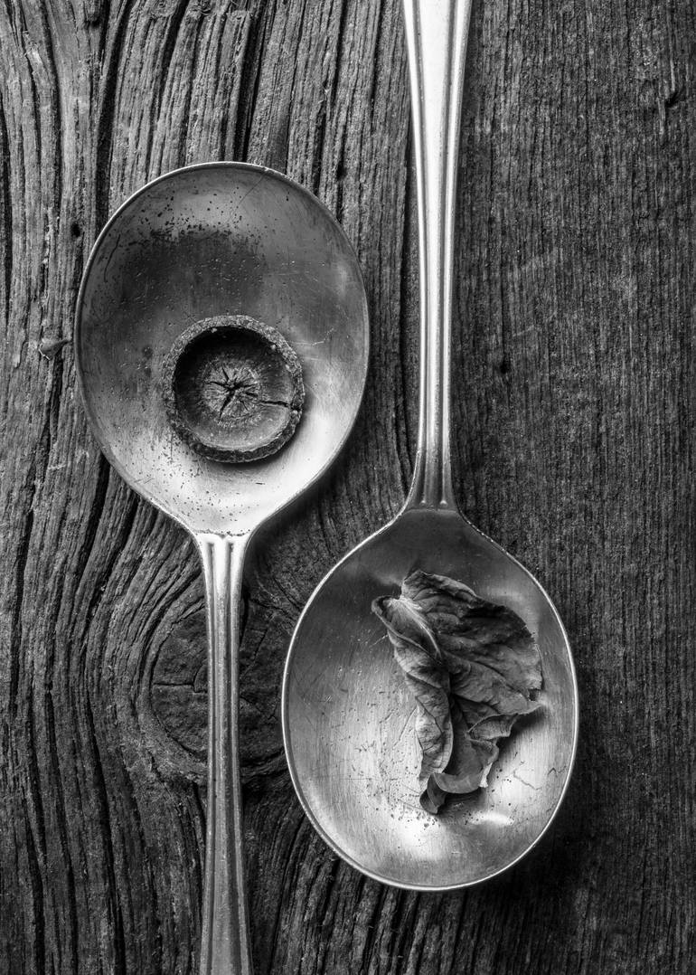 Vintage antique silver spoons over rustic wood holding natural objects in this still life by fine art photographer Edward M. Fielding