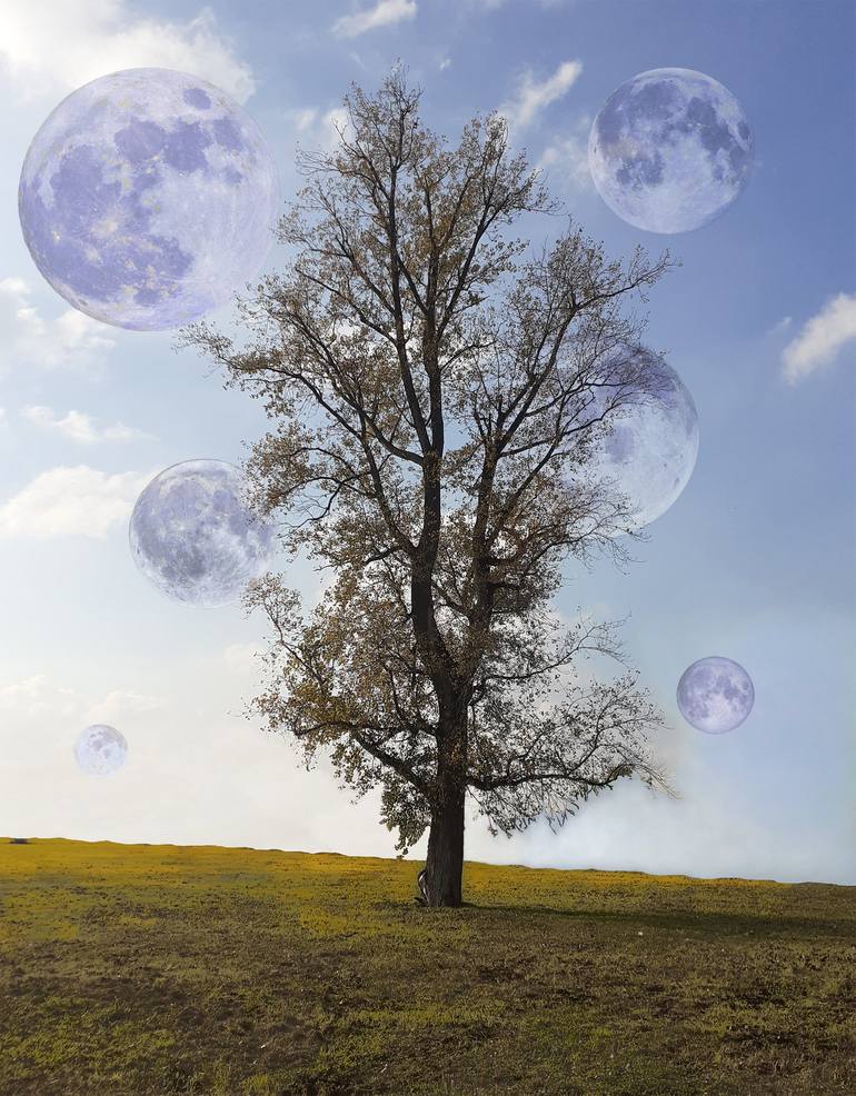 A mesmerizing surreal artwork featuring a solitary tree in a vast field, illuminated by six glowing moons in varying sizes. The ethereal blue tones of the moons blend harmoniously with the soft, clear sky, creating a serene and dreamlike atmosphere. This piece captures the mystery and beauty of a ce...