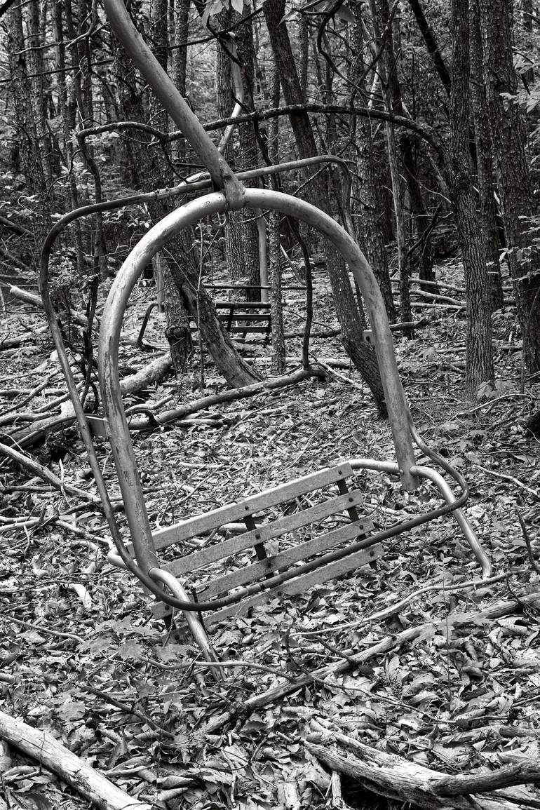 This black and white photograph was taken in the woods on the mountain where I live. Decades ago, there was a ski chair lift, but the facilities closed and were abandoned. Today, the forest is reclaiming space, with trees taking over.