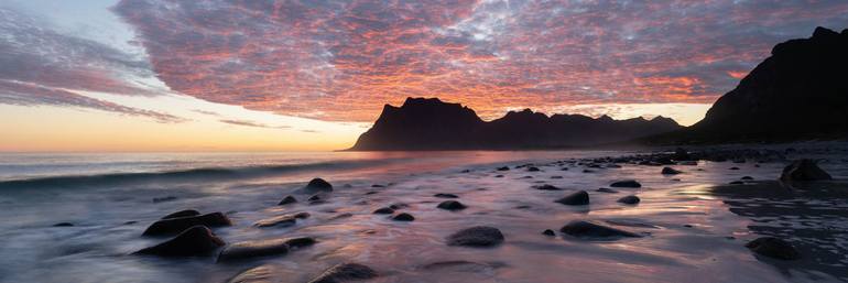 The incredible Uttakleiv Beach in the Lofoten Islands during an all night sunset and sunrise in the summer. This is a high resolution Metallic Print, face that glows mounted to Acrylic with an archival Aluminium Dibond backing. This piece floats off the wall for a modern look and is ready to hang w...