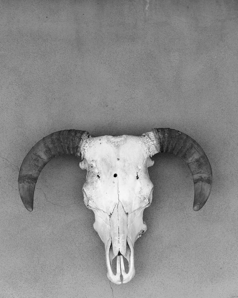 The whitened bones of a ram’s skull and horns lay on a flat background.