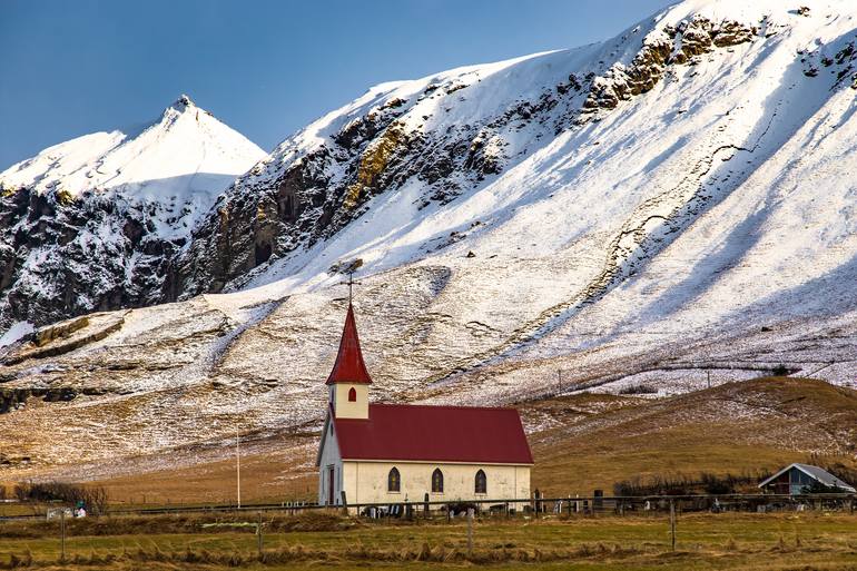Icelandic church near Vik sunny day mountain background Southern Iceland Northern Europe