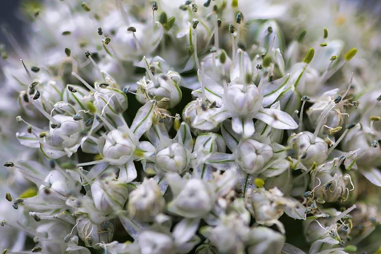Close-up view of a cluster of delicate white flowers with prominent stamens and green buds interspersed throughout. The flowers are densely packed, and their intricate petals create a soft, textured appearance.