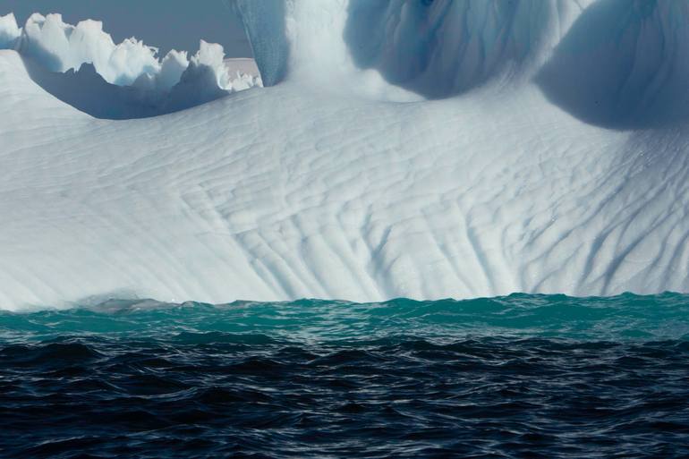 Here, I find an unusual combination of forms and patterns yielding a somewhat disconcerting, but striking image. It contrasts colors and movements. While typical of Antarctica independently, in juxtaposition, the different waters and ice create ambiguity. Yes, it's an iceberg. And, the design app...
