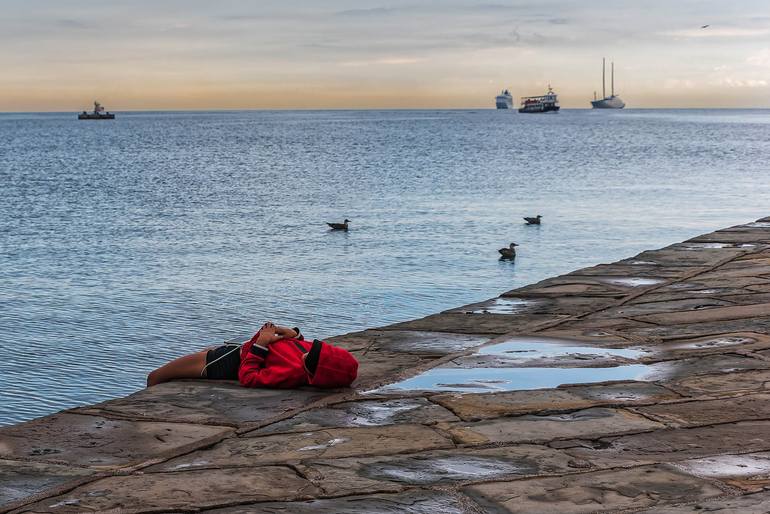 Relaxed Boy lying at the mole audace in trieste, italy, sunset mood, ships in background, street photography. Printed with pigment ink on canvas in wooden stretcher (depth 2cm), ready to hang